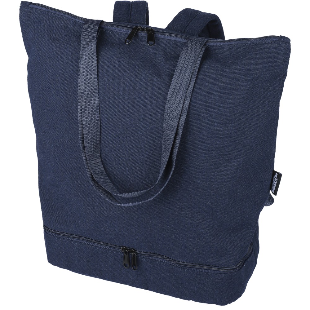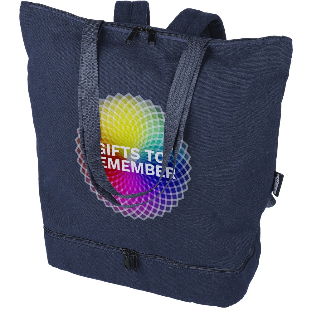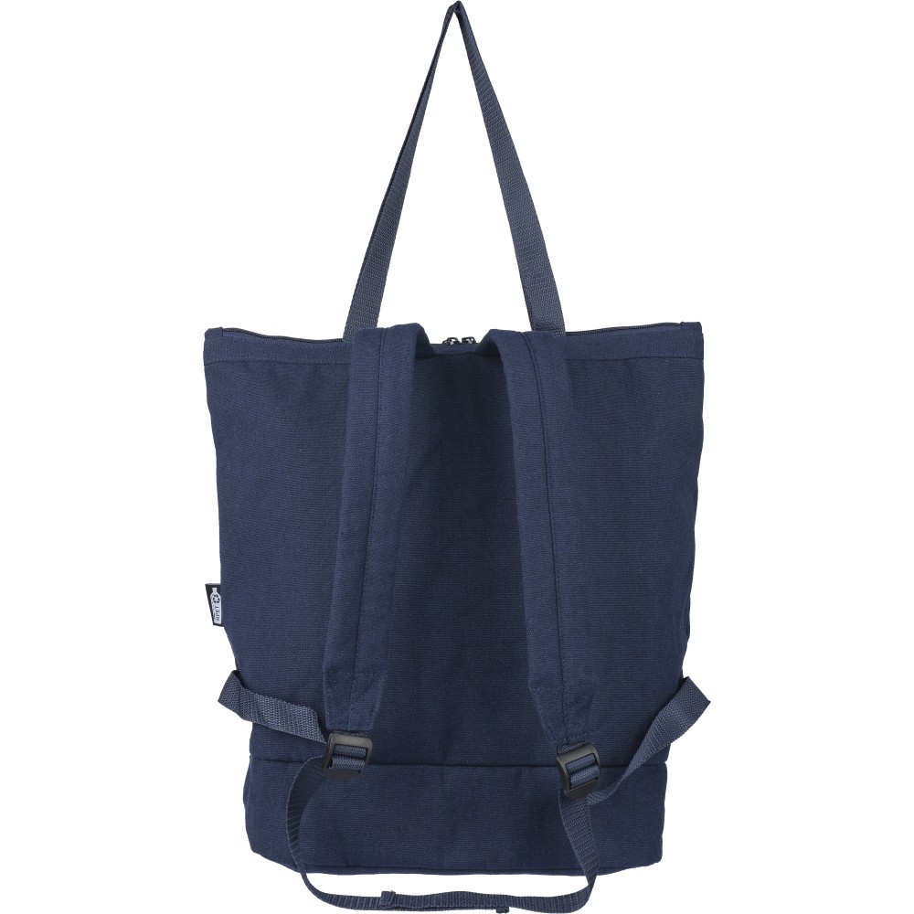 Bevásárlótáska és hátizsák 330 g/m2 újahasznosított policotton anyagból, 210D poliészter béléssel. Egy nagy cipzáras rekesszel a tetején, cipzáras rekesszel az alján, 15"-es laptoptartó résszel, két belső rekesszel és egy külső cipzáras résszel. Hordozófüllel és párnázott, állítható vállpánttal. Űrtartalom: 30 liter, teherbíró képesség: 15 kg. Címkét tartalmaz.