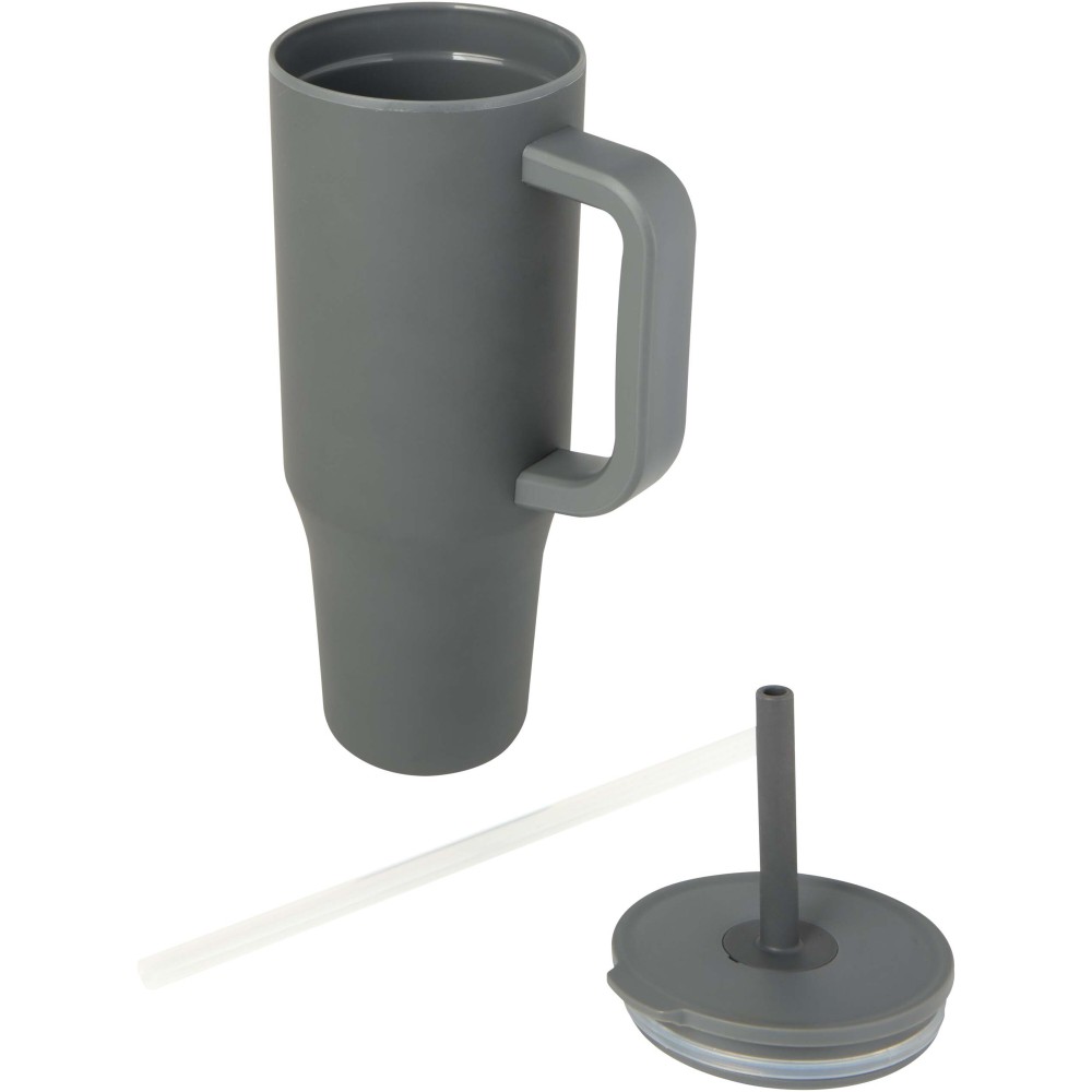Strapabíró külső fallal rendelkező tumbler, amely RCS tanúsítvánnyal rendelkező újrahasznosított rozsdamentes acélból készült, belső fala pedig műanyag. Beépített, élelmiszeripari szilikon szívószállal és fröccsenésgátló, rányomható tetővel a kényelmes ivás érdekében. Meleg italokhoz is használható, de ezek fogyasztása szívószállal nem ajánlott. A forró italok hűtéséhez javasolt a tető eltávolítása. Űrtartalom: 900 ml. Kézi mosogatás javasolt.