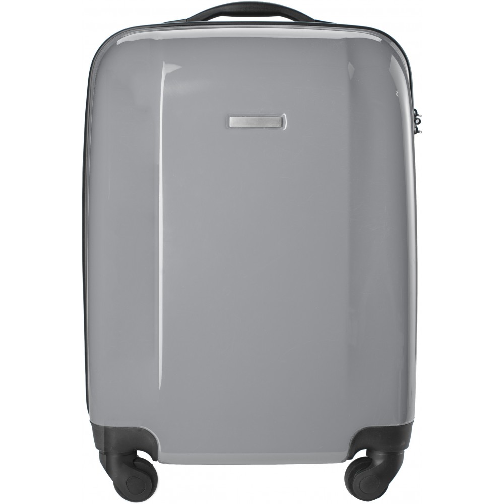 Keményfedelű bőrönd PC/ABS műanyagból, 4 körbeforgó kerékkel, beépített számzárral. Emblémzásra alkalmas fémlappal, ami fixen a terméken van.