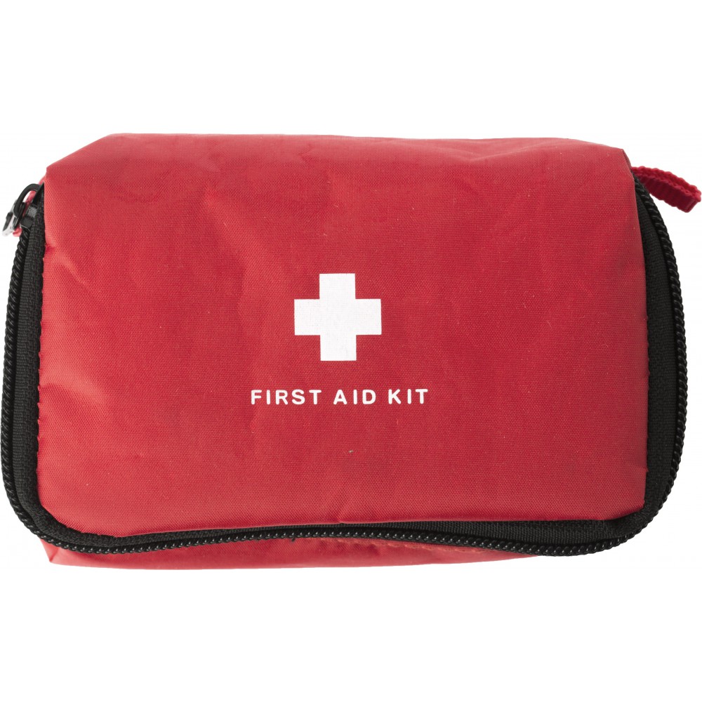 Elsősegélykészlet nylon tokban. Tartalma: kötszerek, ragtapaszok, fertőtlenítő kendők és olló.