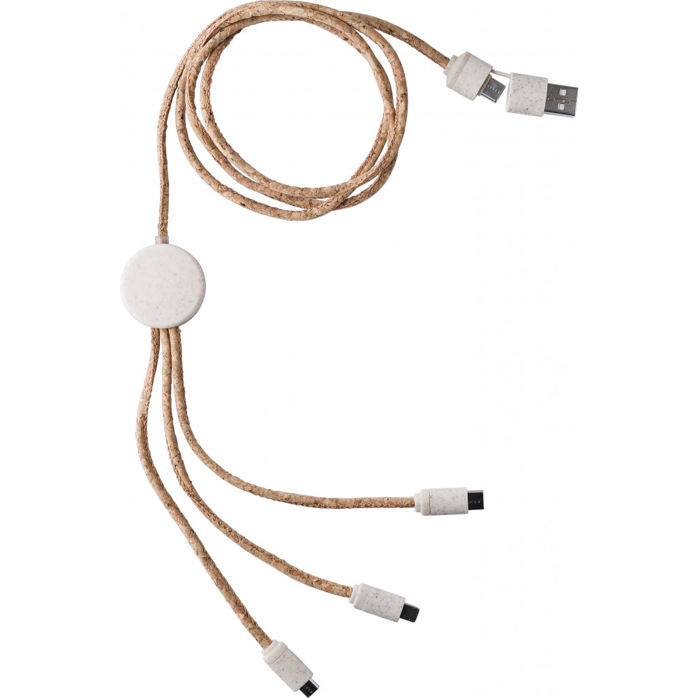 Parafa töltőkábel. Töltőkábel hossza kb. 1,20 m. USB-A/USB-C / Lightning, típus-C / mikro-usb. A dugaszok szalma felhasználával készültek. Kraft dobozba csomagolva.