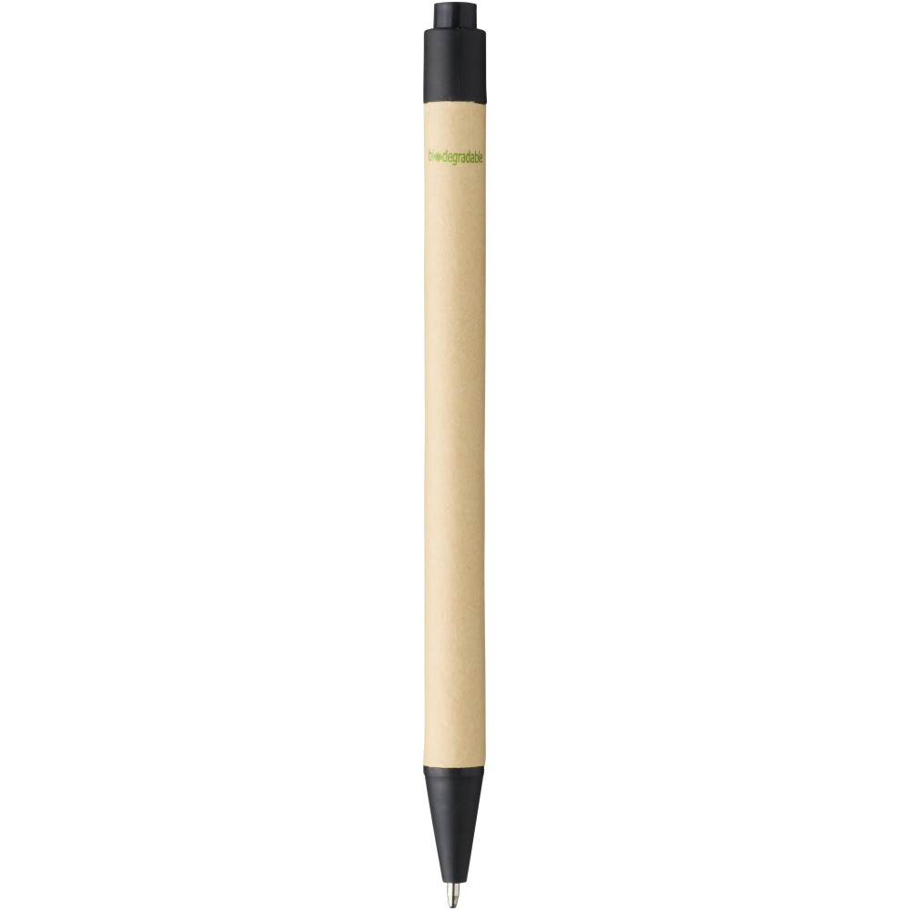 Környezetbarát golyóstoll fekete tollbetéttel, nyomógombos mechanizmussal, biológiailag lebomló papíranyagból készült tolltest és kukorica műanyag kiegészítők. Az újrahasznosított kartondoboz színe nem egységes.