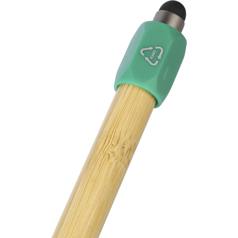 Bambusz golyóstoll újrahasznosított ABS pörgettyűvel és fekete érintővel a nyombógombon. A tollhegy vastagsága 1.0 mm, íráshossz: kb. 800 méter. Az újrahasznosított anyagra utaló logó a tollra van gravírozva.