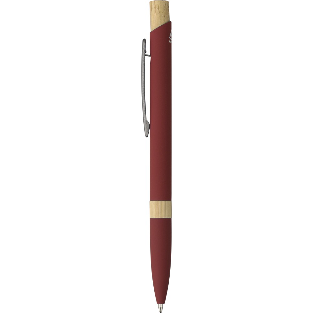 Golyóstoll újrahasznosított alumíniumból, gumírozott bevonattal, bambusz nyomógombbal és bambusz gyűrűvel a tolltesten. Kék tollbetéttel. A tollhegy vastagsága 1.0 mm, íráshossz: kb. 800 méter. Az újrahasznosított anyagra utaló logó a tollra van gravírozva.