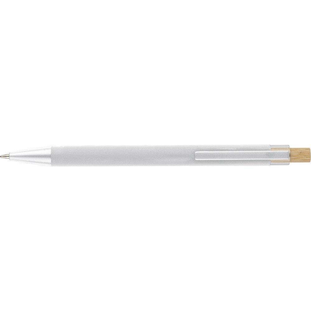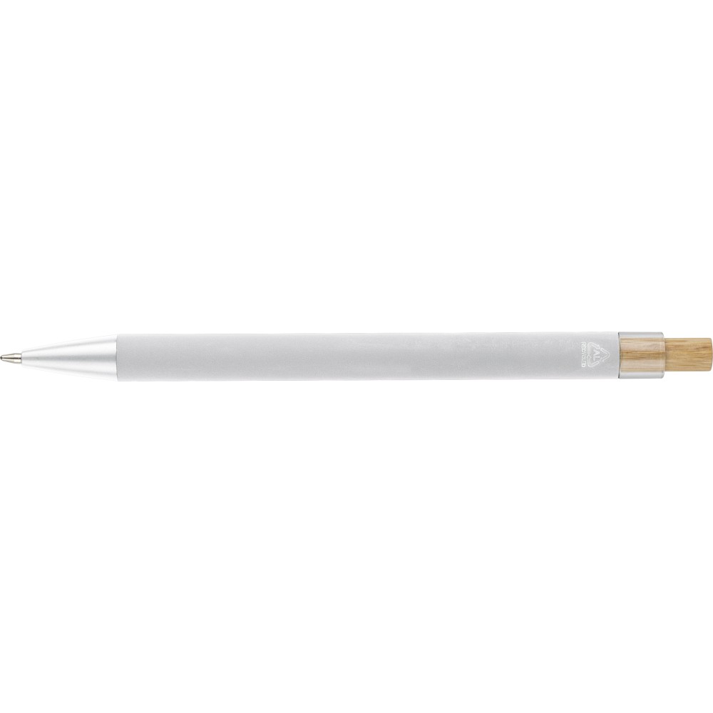 Újrahasznosított alumíniumból készült golyóstoll bambusz nyomógombbal és AS műanyag díszítéssel, fém klippel és a toll színével harmonizáló műanyag tollheggyel. A tolltesten lézergravírozott recycled (újrahasznosított) alapanyagra utaló logó található. Megközelítőleg 800 méter íráshosszúságú, kék színű tollbetéttel.
