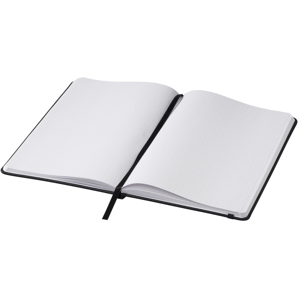 A/5 -ös jegyzetfüzet színes gumipánttal és jelölőszalaggal. 96 lapos.( (60g/m2) . Ponthálós lapok.