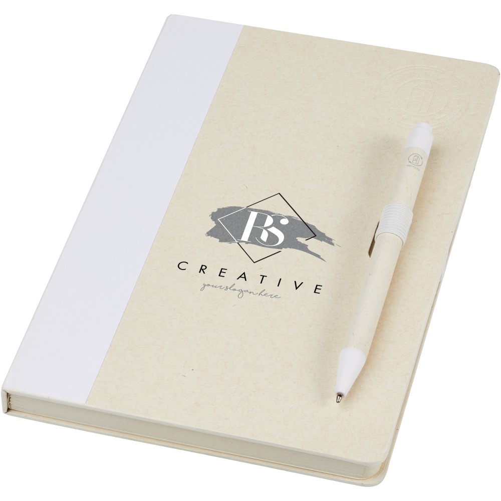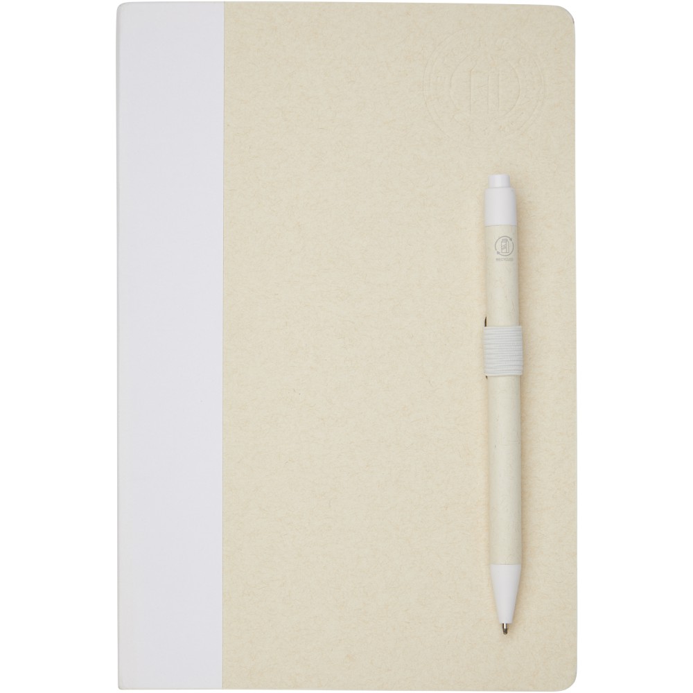 A5 méretű füzet és golyóstoll készlet. A jegyzetfüzet 80 vonalas lapot (80 g/m2) tartalmaz, amelyek újrahasznosított tejes kartondobozokból készülnek (akár 70%), színes papírgerinccel és egy tollhurokkal. A tollhurokban egy nyomógombos golyóstoll található a jegyzetfüzet színéhez illő színben. A toll teste ugyanabból az újrahasznosított anyagból készült, a gomb, a klipsz és a hegy pedig színes PLA műanyagból készült. A toll fekete tollbetéttel érkezik. A használt tejesdobozokat összegyűjtik, válogatják, feldolgozzák és papírrá alakítják, így a hulladékból hasznos termék készül.