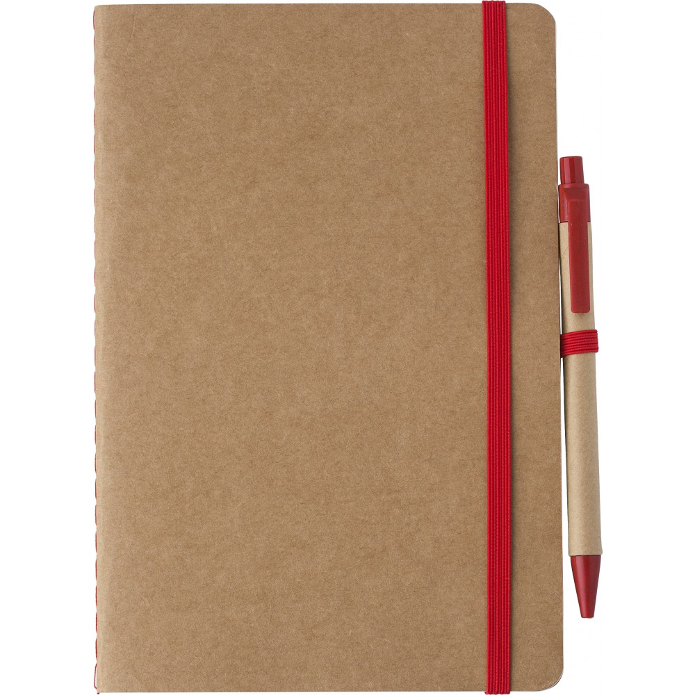 Újrahasznosított karton jegyzetfüzet 60 sima lappal. Tartalmazza a hozzáillő karton/szalma tollat kék tollbetéttel. Gumis összefogó pánt és tollhurok.