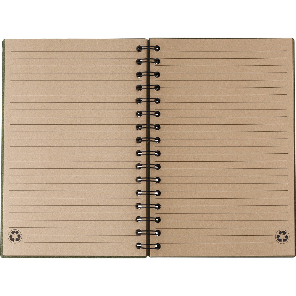 Újrahasznosított kartonból készült, keményfedeles spirálfüzet 80 vonalas, újrahasznosított barna papírlappal. Lapok minősége: 65 g/m2. Az újrahasznosított alapanyagra utaló logó minden lapon látható.