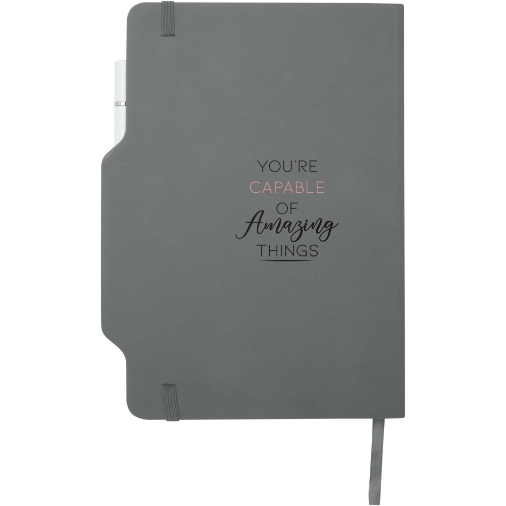 A Nexus A5 keményfedeles jegyzetfüzet egy toll/ceruza kombinációval praktikus és stílusos választás. 80 krém színű, 70 g/m2 vonalas lapot tartalmaz, lekerekített sarkokkal, rugalmas zárópánttal és szalagkönyvjelzővel. A kétvégű toll egyik oldala fekete tintával író golyóstoll, a másik oldala ceruza. A toll íráshossza: 1000 méter. Tollhegy mérete: 1,00 mm.