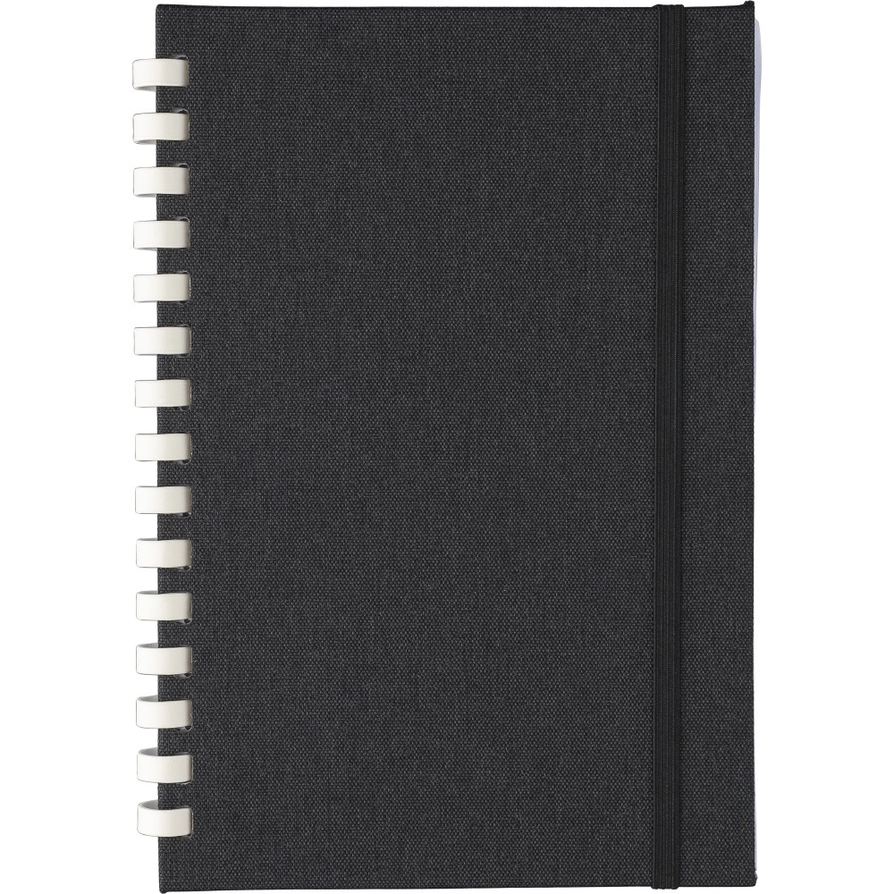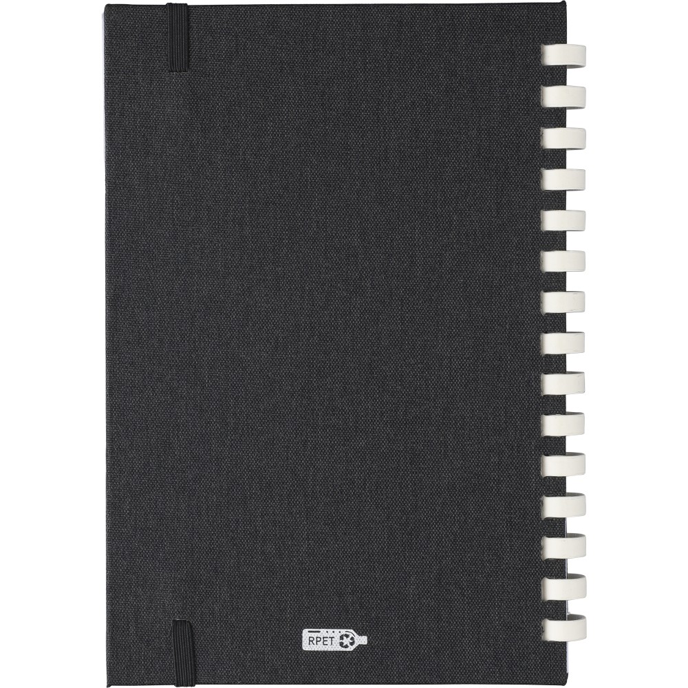 rPET jegyzetfüzet, kb. A5-ös méretű, 80 lapos. Kemény borítóval és rugalmas zárópánttal. Fehér karton spirállal (15 karikás), szalagos könyvjelzővel és 70 g/m2-es vonalas papírral. A hátoldalon rPET logóval. Selyempapírba csomagolva, nejlonzacskó nélkül.