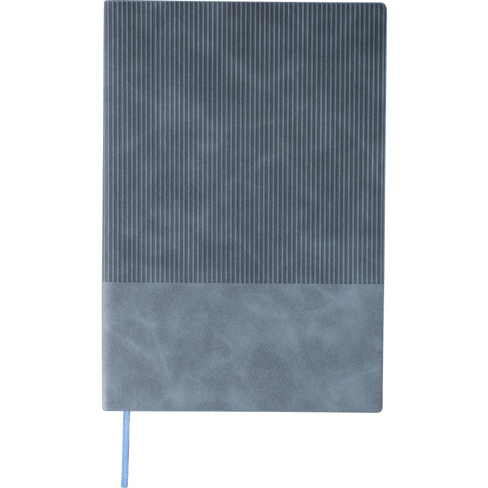 Újrahasznosított PU jegyzetfüzet, kb. A5-ös méretű, 100 lapos. Kemény borítóval és kordbársony hatású bevonattal az elülső és a hátlap felső részén. Tartalmaz egy szalagos könyvjelzőt és 80 g/m2-es vonalas lapokat. A hátoldalon dombornyomott újrahasznosított logóval.