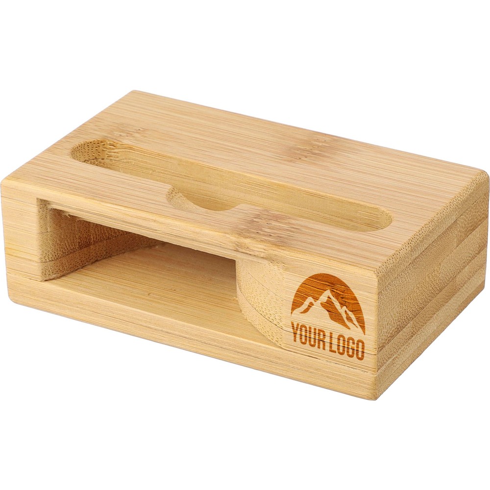 Bambusz telefontartó hangszóró funkcióval. Zenelejátszás közben az alsó részen keresztül erősíti a hangot áram vagy elem használata nélkül. Telefontartó nyílás méretei: kb. 8,2 x 1,2 cm. Egyenként barna kartondobozba csomagolva.