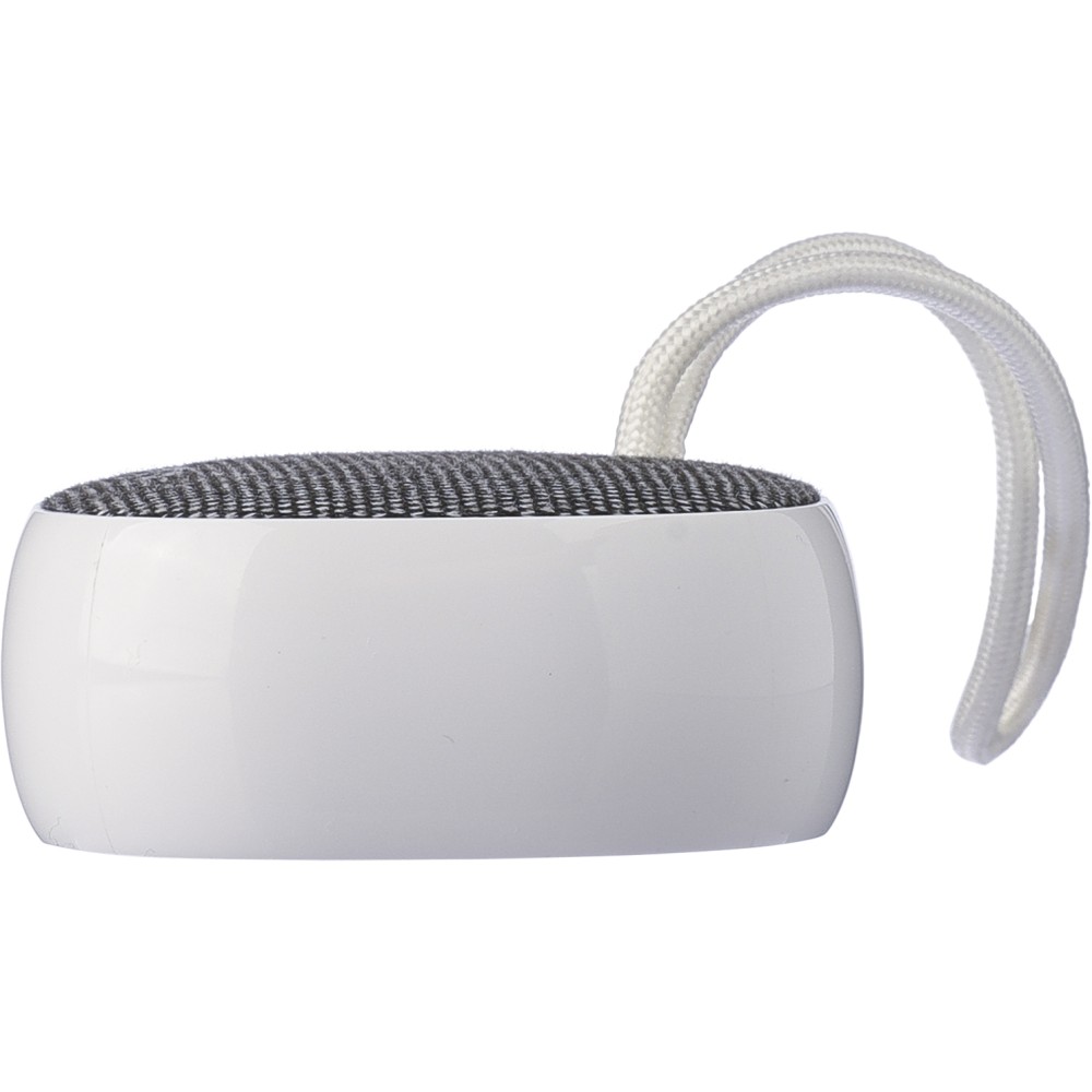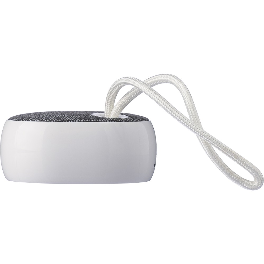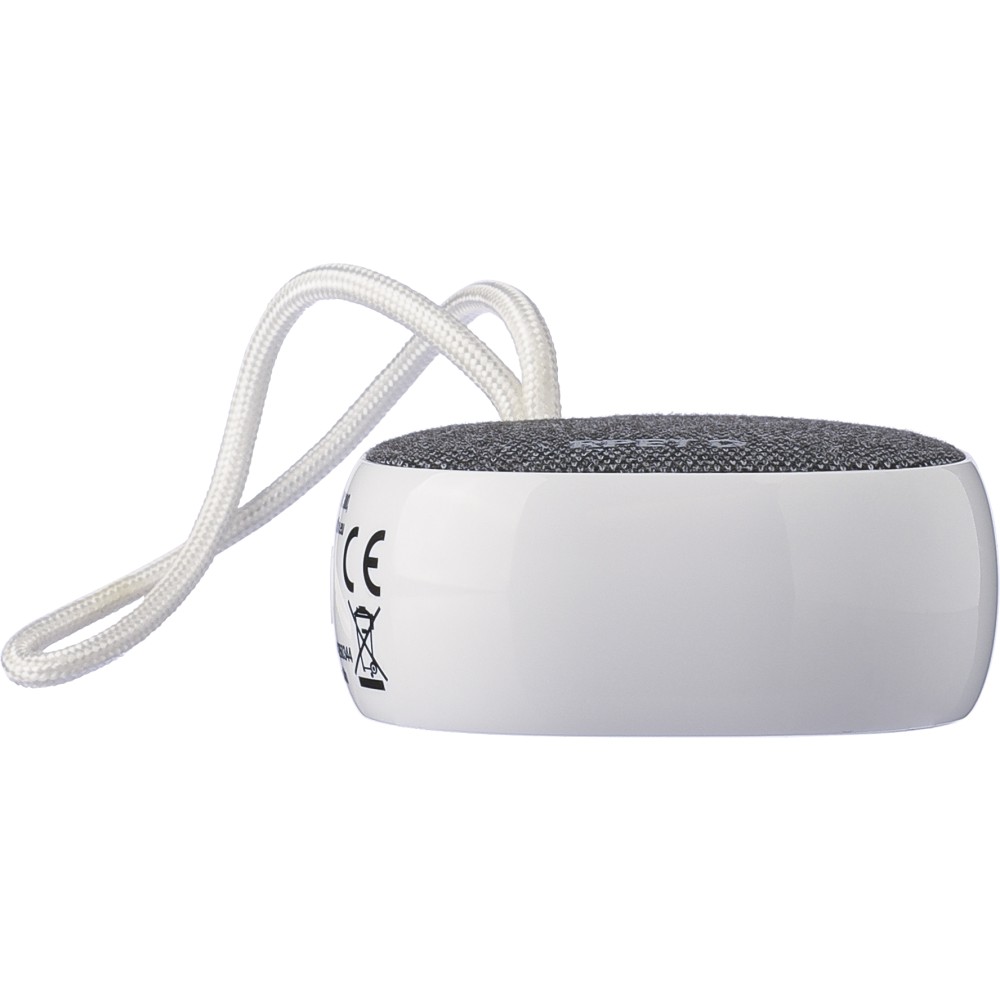 Újrahasznosított ABS és rPET anyagból készült vezeték nélküli hangszóró vékony nejlon hordozópánttal. 3 W teljesítmény, 300 mAh akkumulátor, 5.3-as vezeték nélküli technológia és 10 méteres hatótávolság. 30 cm-es fehér USB-C töltőkábellel. Az anyagon rPET logóval, az oldalán pedig újrahasznosított ABS logóval. Egyenként csomagolva, barna kartondobozban.