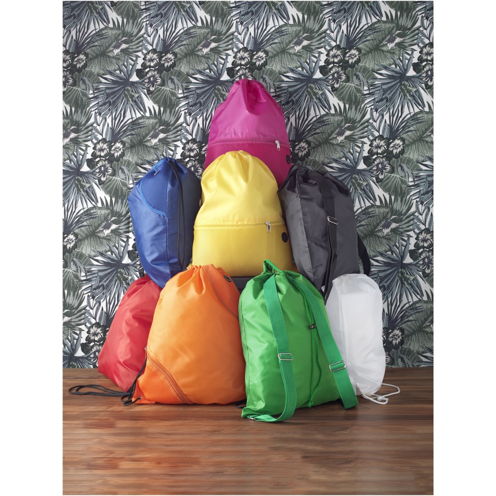 Húzózsinórral zárható nagy fő rekesz. A húzózsinór kialakítása miatt vállon vagy hátizsákként is használható. 210D Polyester.