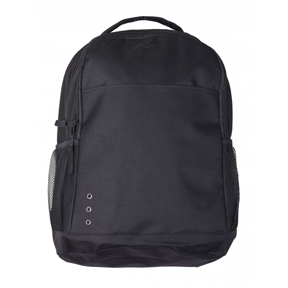 Hátizsák egy nagy rekesszel, egy cipzáras és egy nyitott első zsebbel, két hálós oldalzsebbel és állítható vállpántokkal. 600D poliészter.