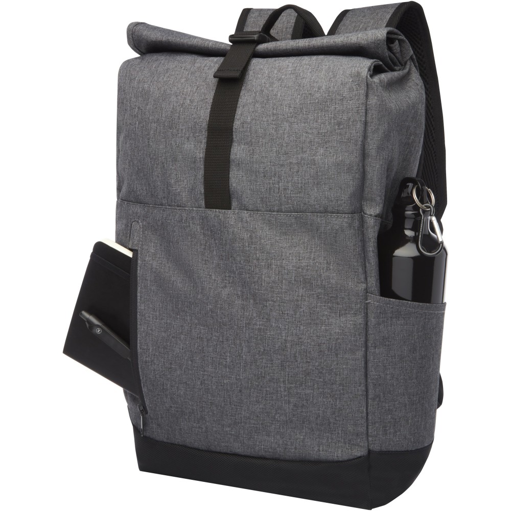 15,6 -es laptop hátizsák párnázott laptoptartóval párnázott, állítható vállpántokkal, cipzáras fő rekesszel, feltekerhető zárással, 2 füllel és elülső cipzáras zsebbel. Poliészter, 300D poliészter.