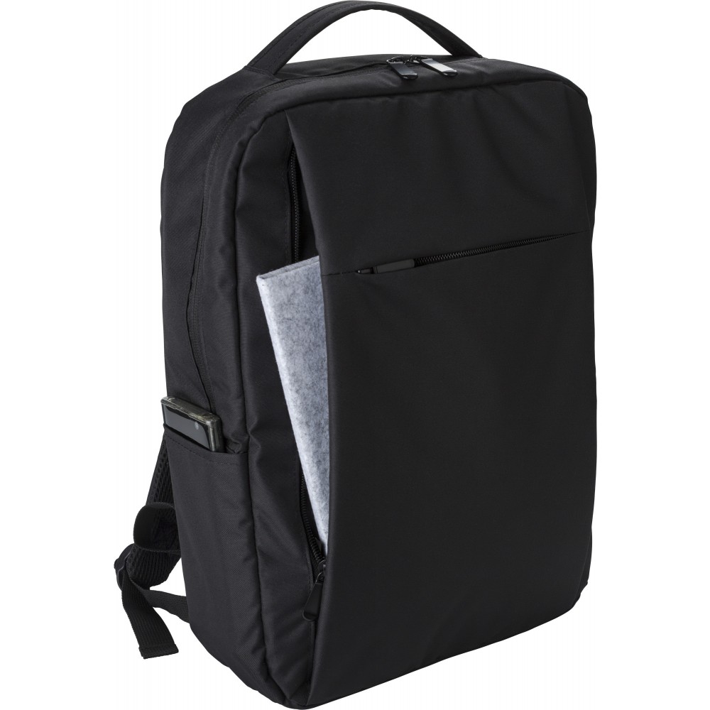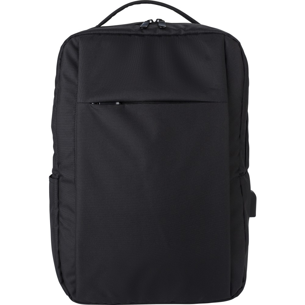 Laptophátizsák 16"-es laptop számára. Belül több zsebbel, laptoptartó rész tépőzárral, egy elülső cipzáras zsebbel. Oldalt USB-A kimenet. RPET 300D és 210D anyag.