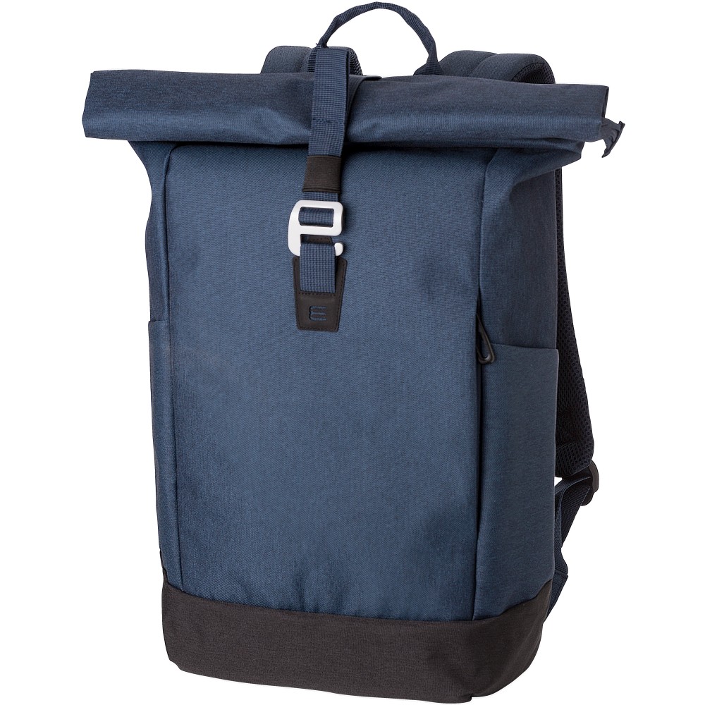 Poliészter (600D) rolltop hátizsák. Egy nagy cipzáras rekesz két csúszózsebbel és egy laptop rekesszel. Cipzáras rekesz elöl. Párnázott hátoldal és pántok. Fémhorog a záráshoz.