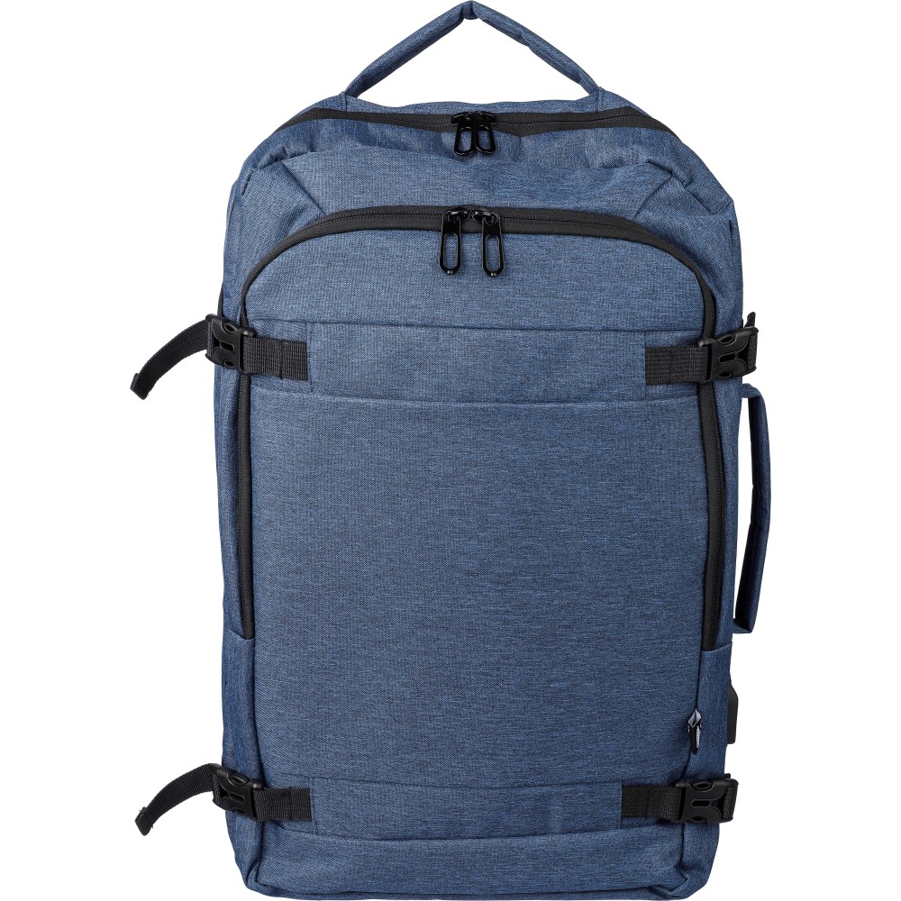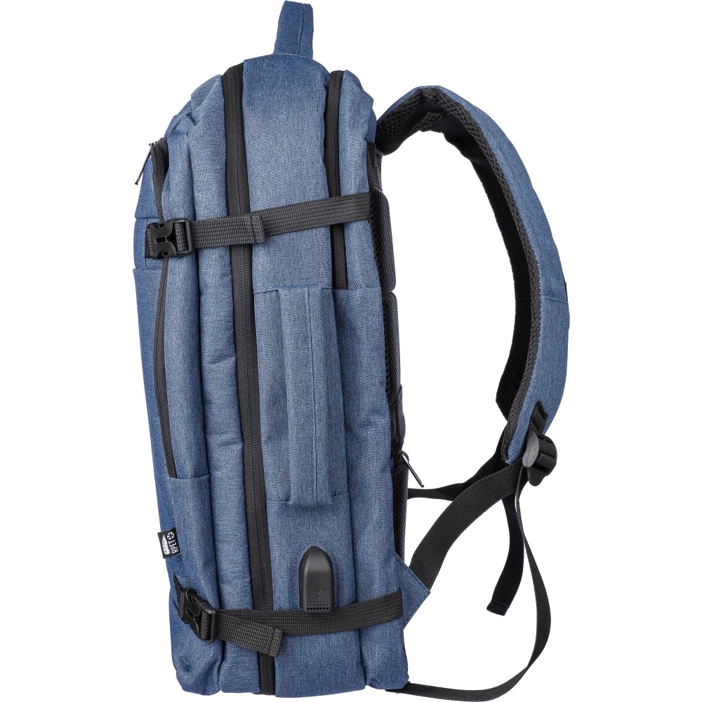 Hátizsák és laptoptáska 17"-es készülékhez. Kézipoggyász méretű. Hordozófüllel a tetején és oldalain. Tépőzáras laptop rekesszel, lopásgátló zsebbel és két nagy cipzáras rekesszel. Szellőző, párnázott hátoldallal, bőröndre húzható pánttal, zárócsatokkal és oldalsó USB-A porttal rendelkezik. Oldalsó csatok segítik a csomag kompakt tartását. Terhelhetősége kb. 12 kg. RPET alapanyagra utaló címke. Anyaga: 300D rPET poliészter.