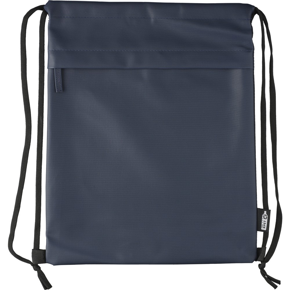 600D rPET poliészter tornazsák. Az elejét PU bevonat teszi vízlepergetővé. Rejtett cipzáras első zsebbel, két tárolórésszel, első és belső zsebekkel. Kapacitása 8 liter, teherbírása 8 kg. Oldalán rPET címkével.