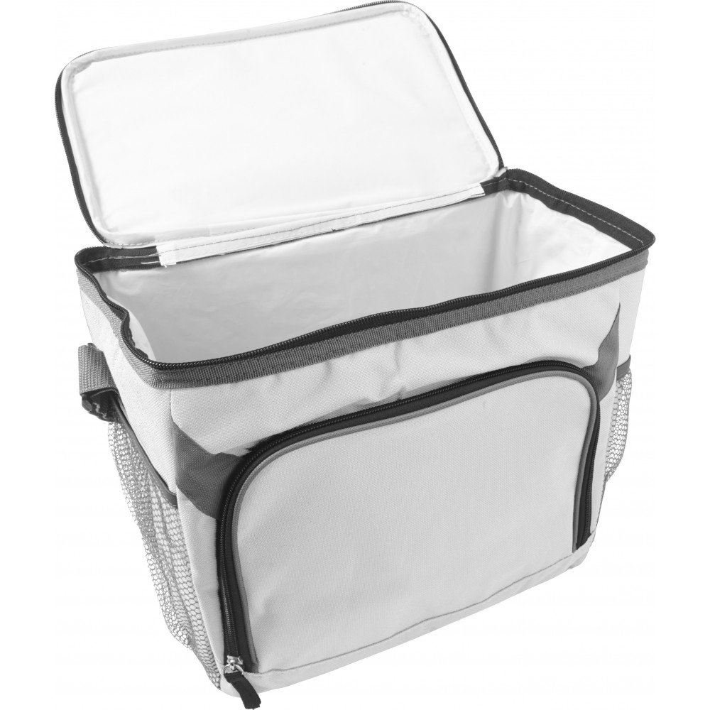 Hűtőtáska nagy cipzáros elsőzsebbel és mindkét végén hálós zsebekkel. 600D poliészter.