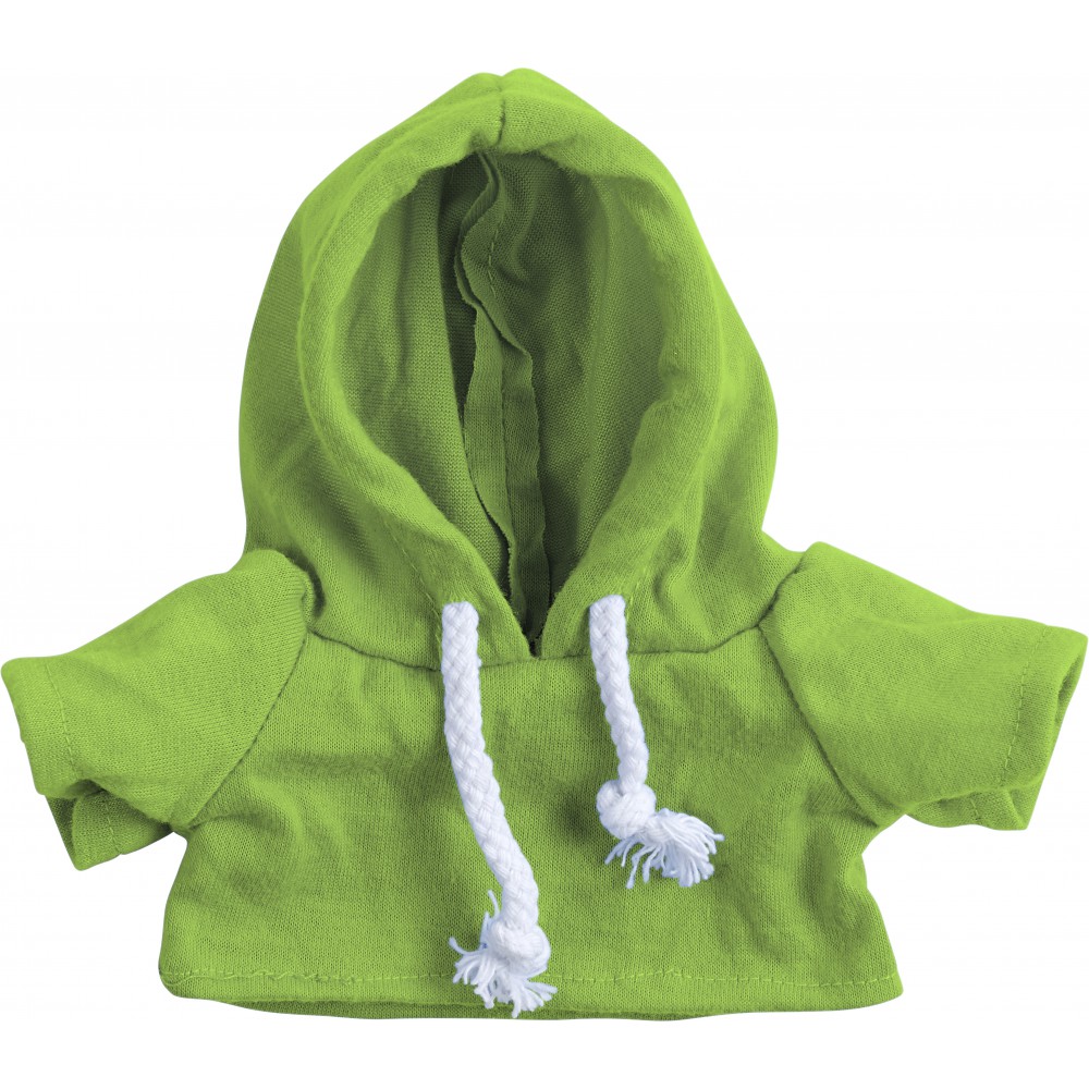 Plüssmackó színes kapucnis pólóban, fehér húzózsinórral. Szeme hímzett.