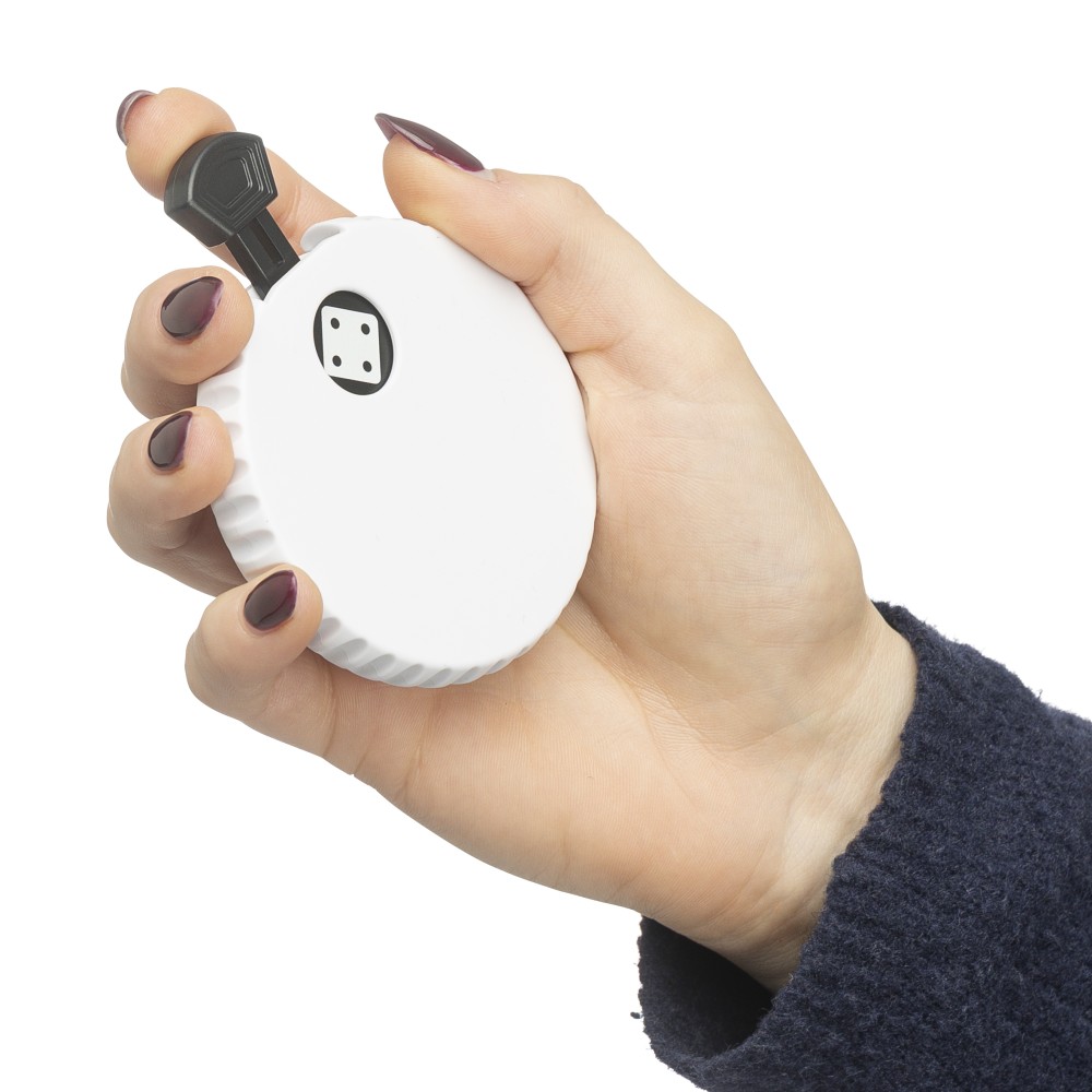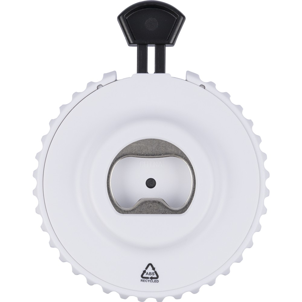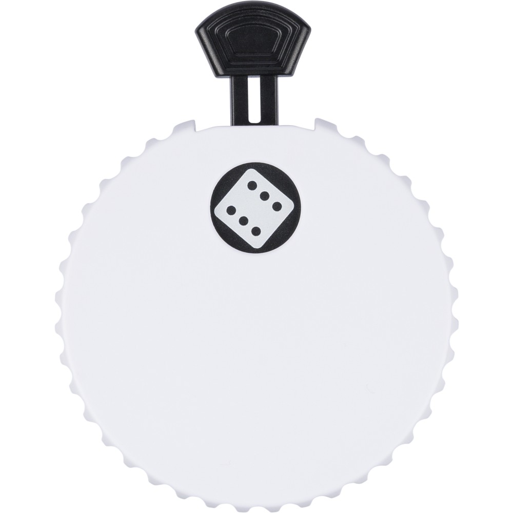 Újrahasznosított ABS-ből készült mechanikus dobókocka felső nyomógombbal. A gomb megnyomásával a mechanika véletlenszerűen jelenít meg egy 1?6 közötti számot. A hátoldalon sörnyitó található. A terméken Recycled ABS (újrahasznosított alapanyagra utaló) logó található. Újrahasznosított politasakba csomagolva.