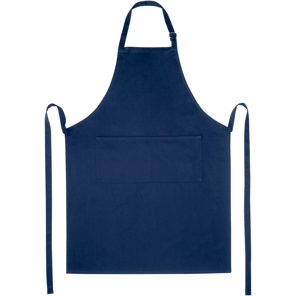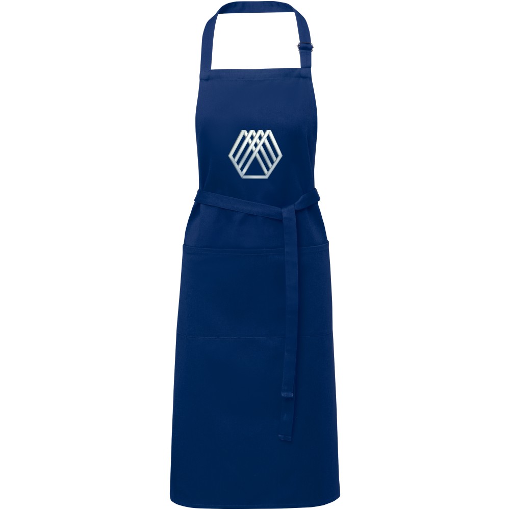 Vastag és masszív anyag, ugyanakkor puha és kényelmes viselet. A két elülső zseb gyors és egyszerű módot kínál a konyhai eszközök tárolására. A kötény nyakában csattal állítható, hátul megköthető. Nagyméretű nyomtatási lehetőség a logók megjelenítéséhez. Pamut twill 65% poliészterből és 35% pamutból, 240 g/m2.
