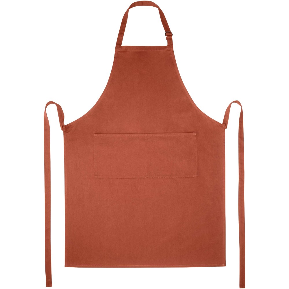 Vastag és masszív anyag, ugyanakkor puha és kényelmes viselet. A két elülső zseb gyors és egyszerű módot kínál a konyhai eszközök tárolására. A kötény nyakában csattal állítható, hátul megköthető. Nagyméretű nyomtatási lehetőség a logók megjelenítéséhez. Pamut twill 65% poliészterből és 35% pamutból, 240 g/m2.