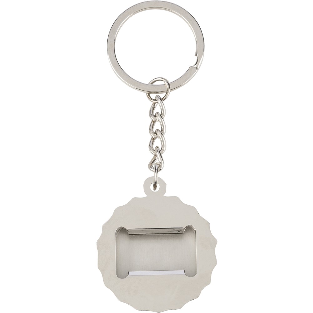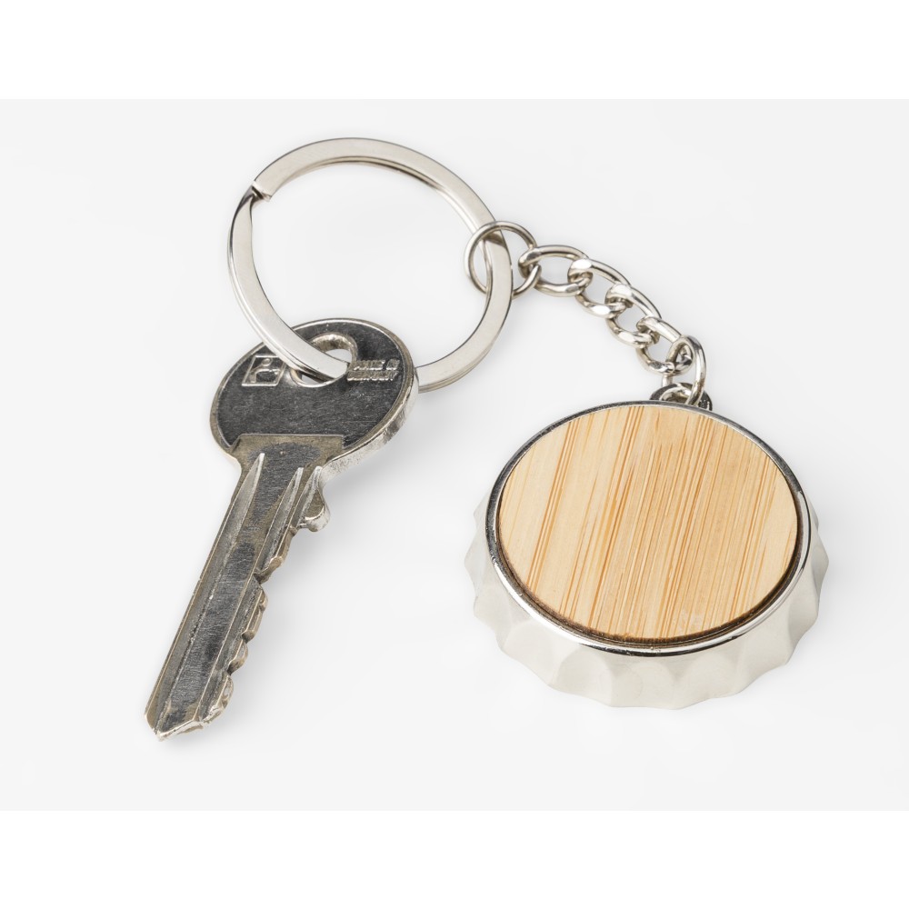 Cinkötvözetből készült kulcstartó elülső oldalán bambusz betéttel, hátoldalán integrált sörnyitó funkcióval, fém kulcskarikával. Papírtasakba csomagolva.