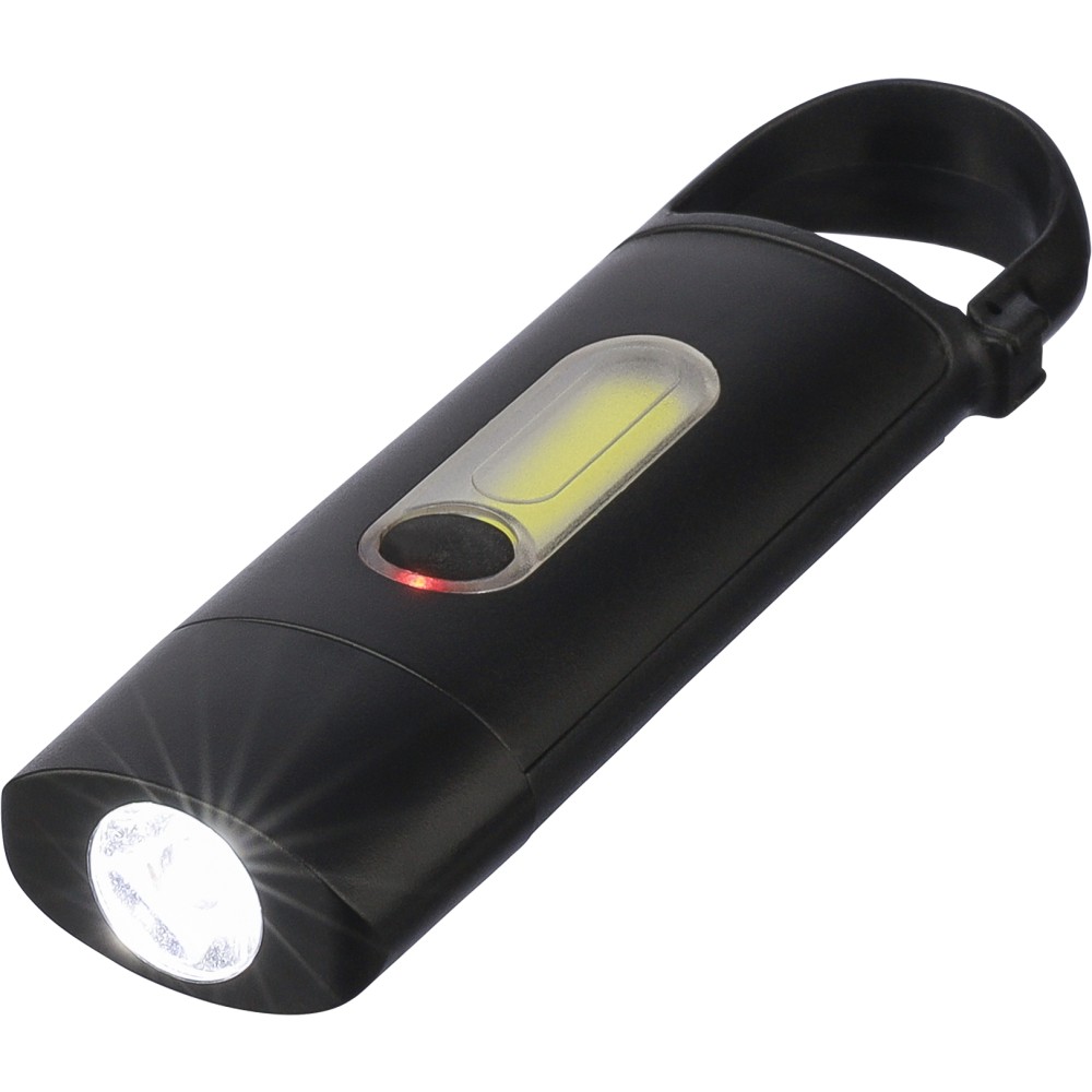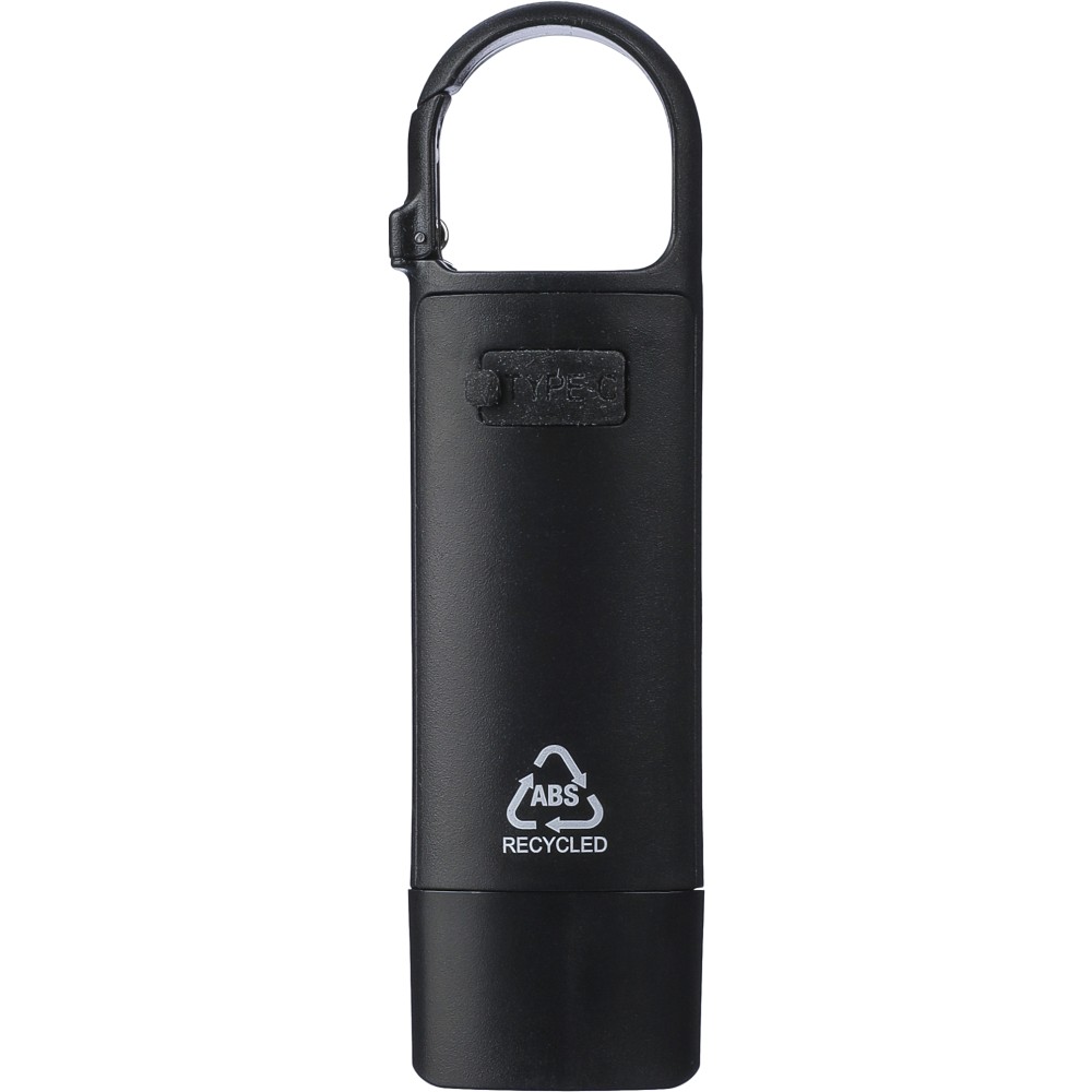 Mini elemlámpa újrahasznosított ABS anyagból, beépített 20 mAh-s, usb-n keresztül tölthető akkumulátorral és karabinerrel. Első COB lámpával és oldalsó COB fényszóróval, mely három világítási móddal rendelkezik. USB-C töltőkábellel, újrahasznosított ABS anyagot jelző logóval. Csomagolása barna papírdoboz.