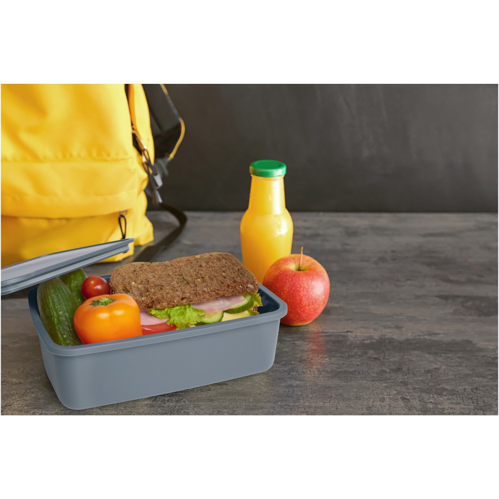 A 800 ml-es Dovi ebéddoboz 100%-ban újrahasznosított műanyagból készült, így fenntartható és trendi választás. Elasztikus szalaggal záródik, amely biztonságosan a helyén tartja a fedelet útközben.