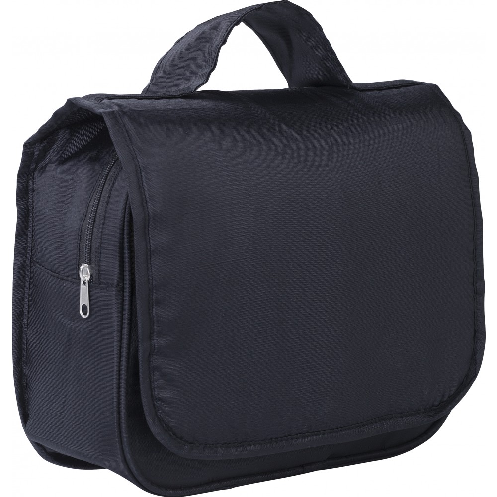 Piperetáska akasztóval. Kinyitva felül átlátszó zseb. Belül egy nagy cipzáras hálós zseb és egy kis zárt cipzáras zseb található. Hátoldalán egy rekesz. Rövid fogantyú. Ripstop 210D.