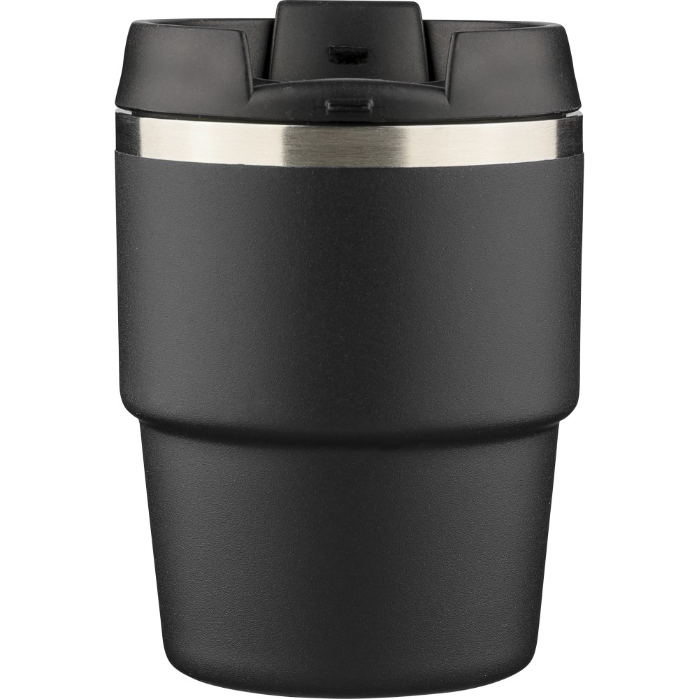 Újrahasznosított rozsdamentes acélból készült, vákuumszigetelésű bögre (175 ml) duplafalú kialakítással és porfestett felülettel, PP csavaros fedéllel. A pohártesten lézergravírozott recycled (újrahasznosított) alapanyagra utaló logó található. Kompakt kialakítása miatt a legtöbb kávégépbe illeszkedik, darabonként barna kartondobozba csomagolva szállítjuk.