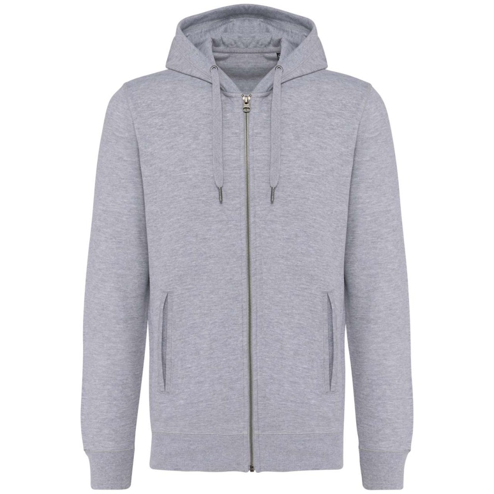 80% bio pamut / 20% újrahasznosított poliészter. Oxford szürke 75% bio pamut / 25% újrahasznosított poliészter. Francia frottír LST (Low Shrinkage Terry). Szövet: enzimes mosás. Karcsúsított szabás. 2 csíkos elülső zseb. Fém cipzár. Bordázott kézelő, bordázott szegély és bélelt kapucni. Fémvégű húzózsinórral. Félhold alakú kivitel a nyakkivágásnál, hogy megkönnyítse a díszítéshez való hozzáférést belülről. Twill szalaggal erősített nyak. Nincs márkacímke a nyakon, csak méretcímke a dekorációhoz való könnyebb hozzáférés érdekében. OEKO-TEX N CQ1007/7 STANDARD 100 tanúsítvánnyal rendelkezik. IFTH.