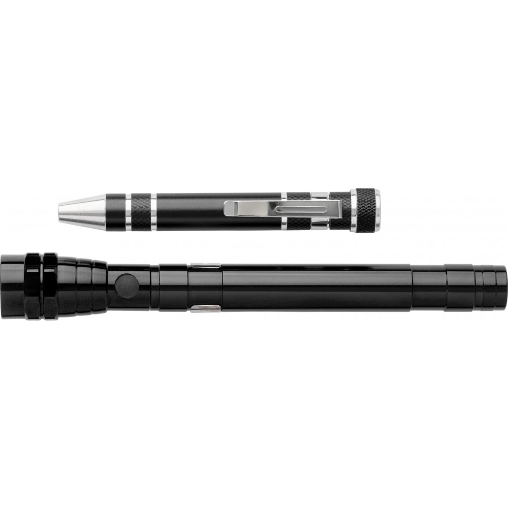 Teleszkópos elemlámpa 3 LED fénnyel és egy toll formájú csavarhúzószett 3 db laposfejű csavarhúzóval és 4 db Phillips csavarfejjel. Csomagolás fekete ajándékdobozban.