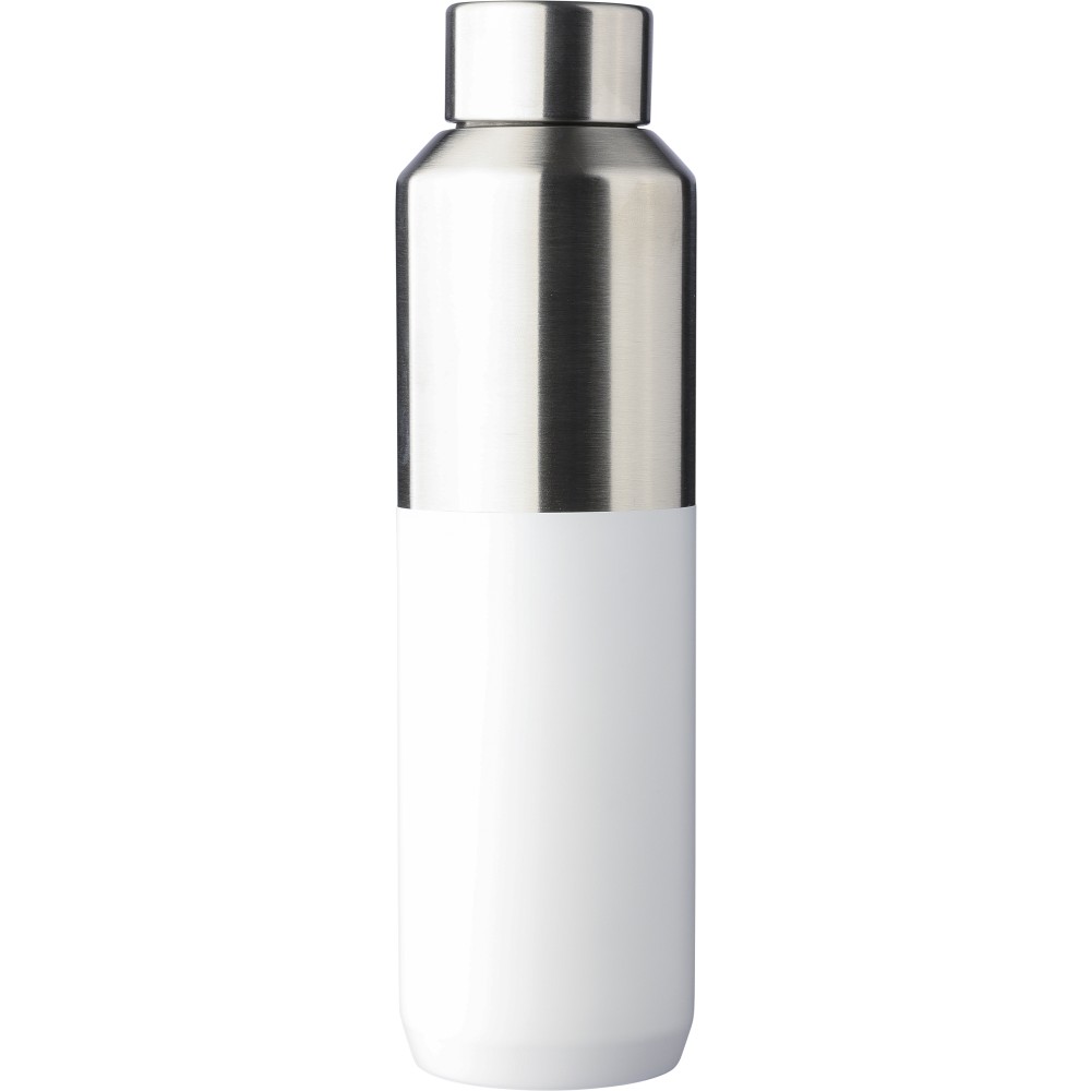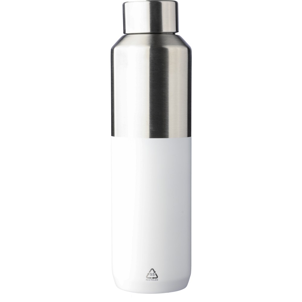Újrahasznosított rozsdamentes acél palack, 600 ml. Duplafalú, vákuumszigetelt, a belső 304-es, a külső pedig 201-es rozsdamentes acélból készült. Kupakja PP, 201-es rozsdamentes acél külsővel. Elején gravírozott újrahasznosított logó található. Csomagolása barna papírdoboz.
