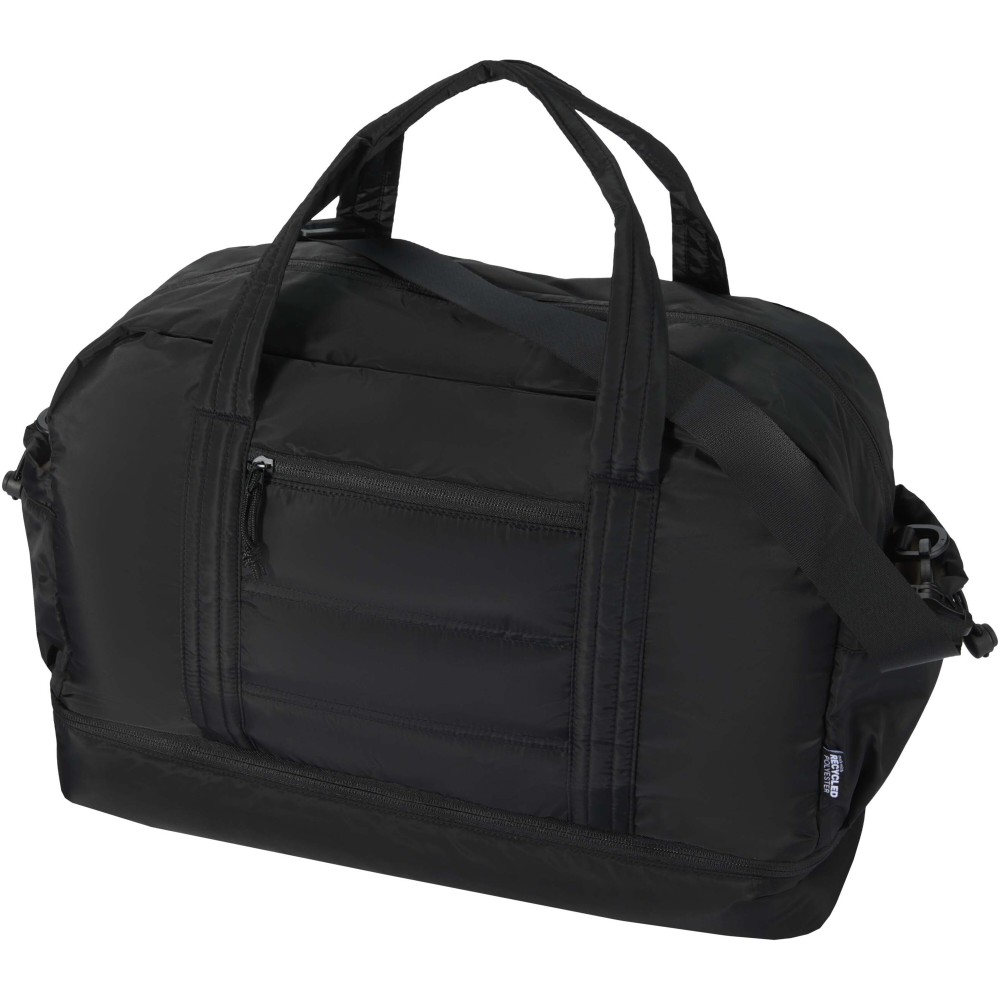 A Puffer sporttáska egyedi megjelenést ötvöz prémium minőségű, GRS tanúsítvánnyal rendelkező újrahasznosított alapanyagokkal, így ideális választás a mindennapi használathoz. A 30 literes űrtartalom tökéletes rövid utazásokhoz, edzéshez vagy hétköznapi teendőkhöz. A táska tágas, cipzáras fő rekesszel rendelkezik ruhák és felszerelések számára, valamint egy szigetelt, PEVA bélésű alsó rekesszel, amely lehetővé teszi a nedves és száraz holmik elkülönítését. A több belső és külső zseb segíti az átlátható rendszerezést, míg a bőröndre rögzíthető pánt, az állítható vállpánt és a kézifogantyúk sokoldalú hordozási lehetőséget biztosítanak. Könnyű és vízlepergető kialakításának köszönhetően ez a sporttáska könnyedén alkalmazkodik az életviteledhez.