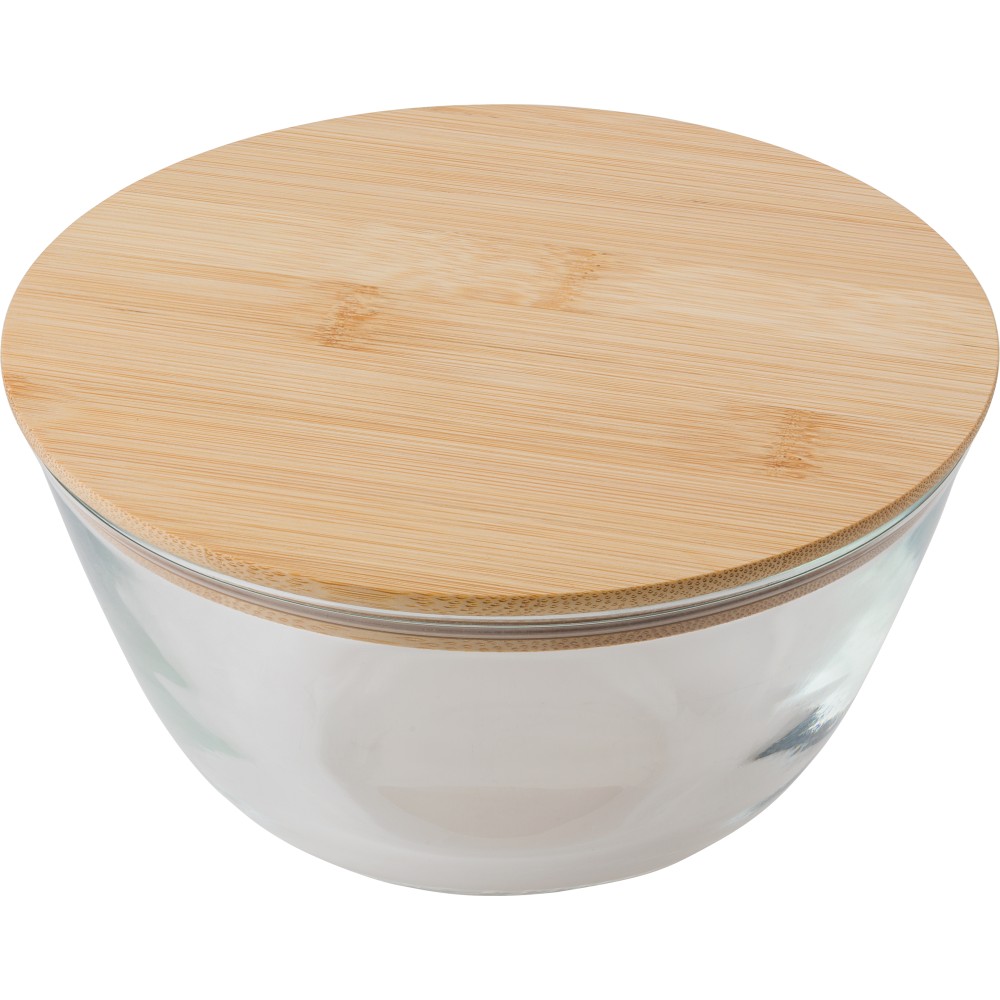 Üveg salátástál bambusz fedéllel és szilikon zárószalaggal. Kapacitás 1200 ml. Speciális erősített üveg (boroszilikát). Vékony, de erős üveg. Egyenként barna kartondobozba csomagolva érkezik.