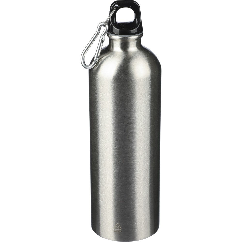 Újrahasznosított rozsdamentes acélból készült 750 ml-es szimplafalú kulacs PP kupakkal és alumínium karabinerrel. Az újrahasznosított anyagra utaló logó a palackra van gravírozva. Mosogatógépben nem tisztítható.