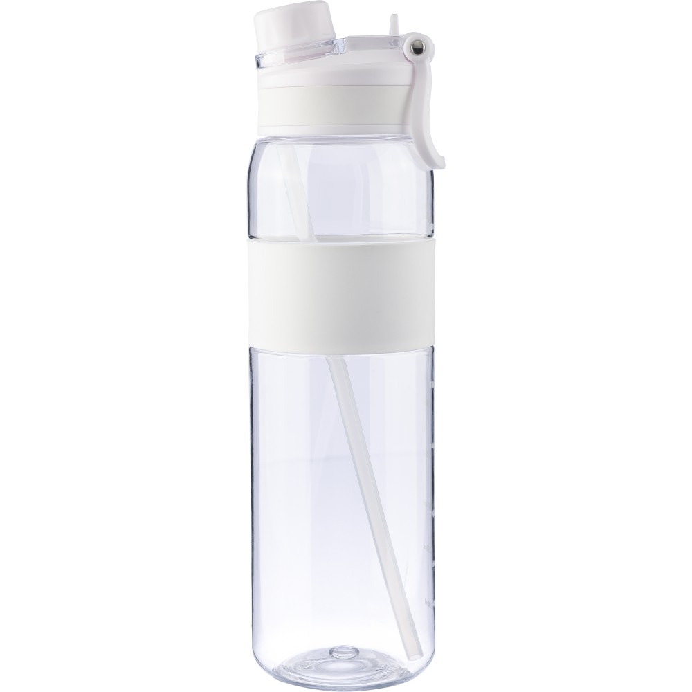 Tritán kulacs, 900 ml-es. Kétféle használati lehetőséggel: csavaros záródású kupak vagy visszahajtható végű szívószál. Szilikon markolattal, PP hordozófüllel és nyomtatott űrtartalom-jelzővel.